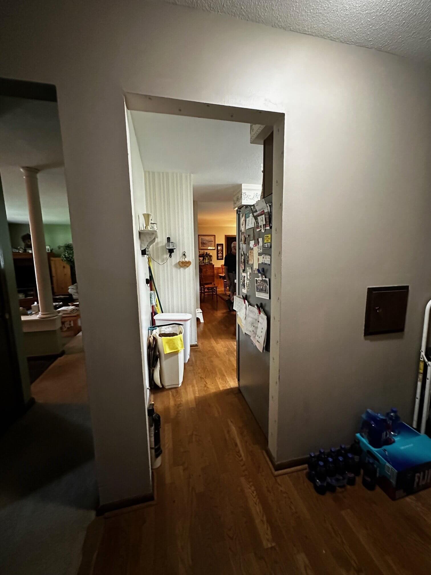 I was excited for this project and for Gwen! Not only because the kitchen had such good bones, but because I knew we could make some changes to really give the space that Wow effect. Gwen was going to update all the appliances, and Neil was willing to put in the work to move them around if necessary. Spoiler alert: it was necessary! There was a hall adjacent to the kitchen with a door that led to the back yard, but Gwen never used it, preferring to go outside via the four-season porch off the dining room. The initial thought was to remove the exterior door as well as the wall and make it part of the kitchen. There were also discussions of bringing the washer and dryer from the basement up to the bedroom off the back hall that served as her home office.