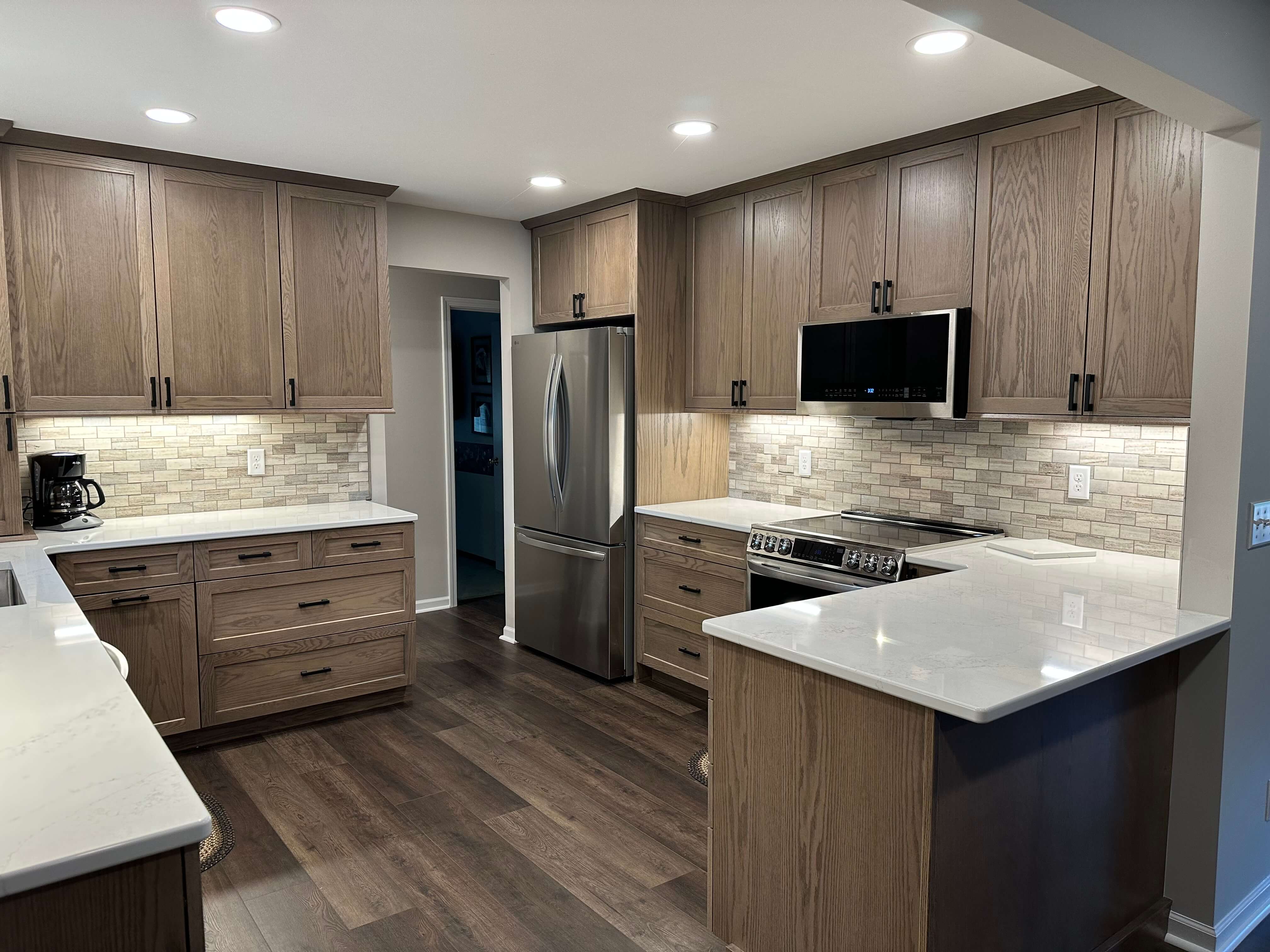 A Dura Supreme kitchen featuring the Hudson Red Oak door with the Cashew stain.