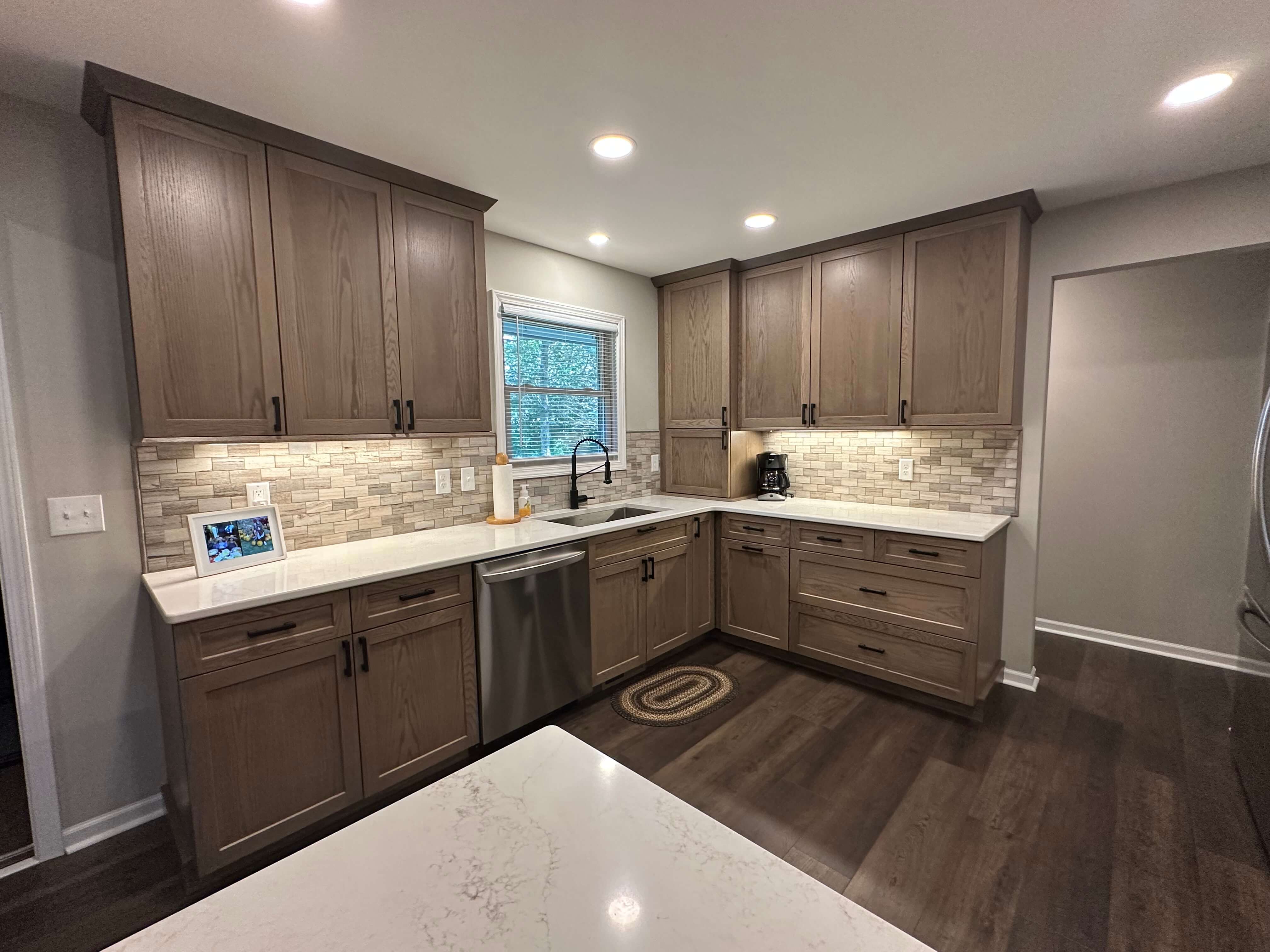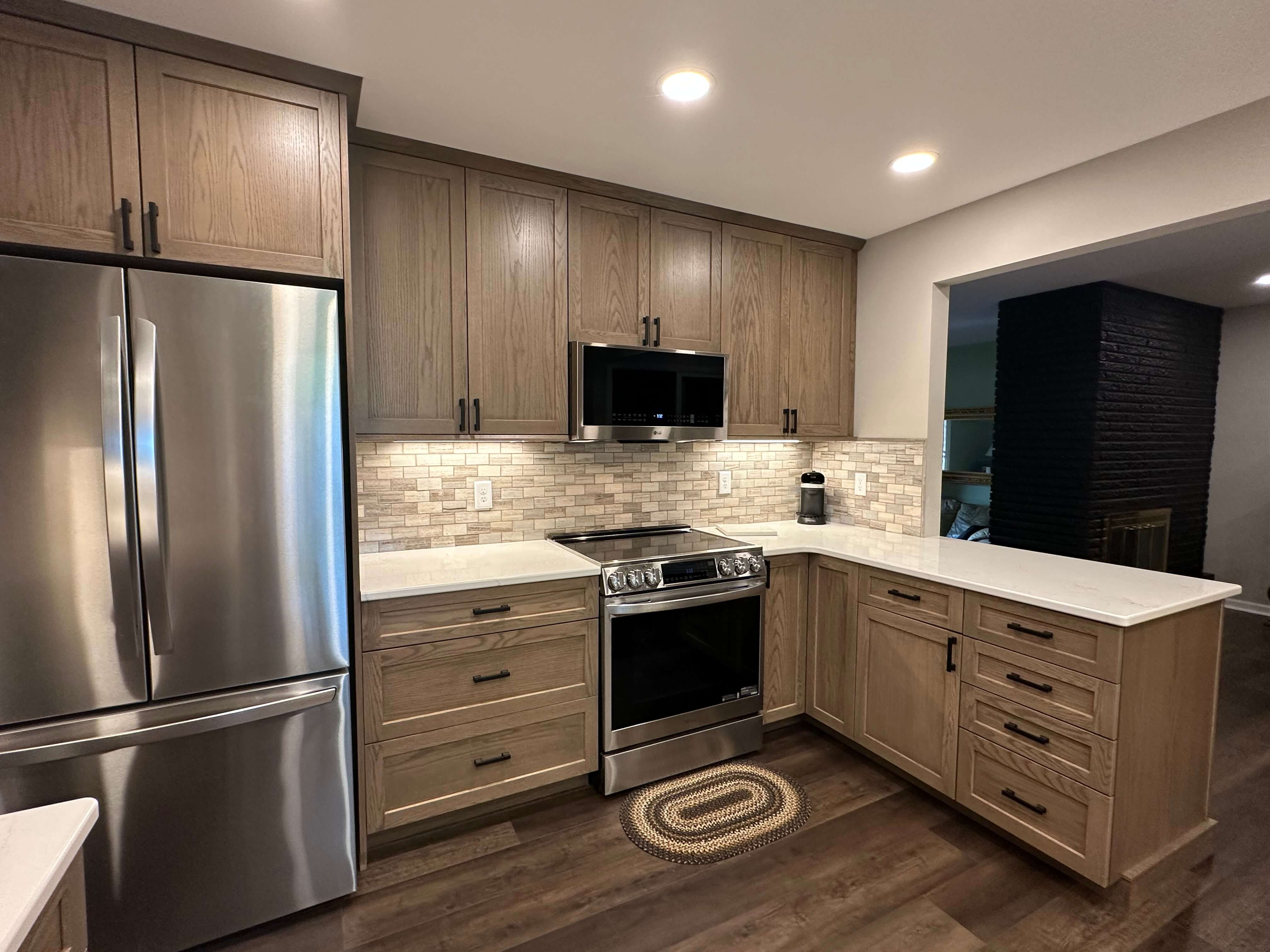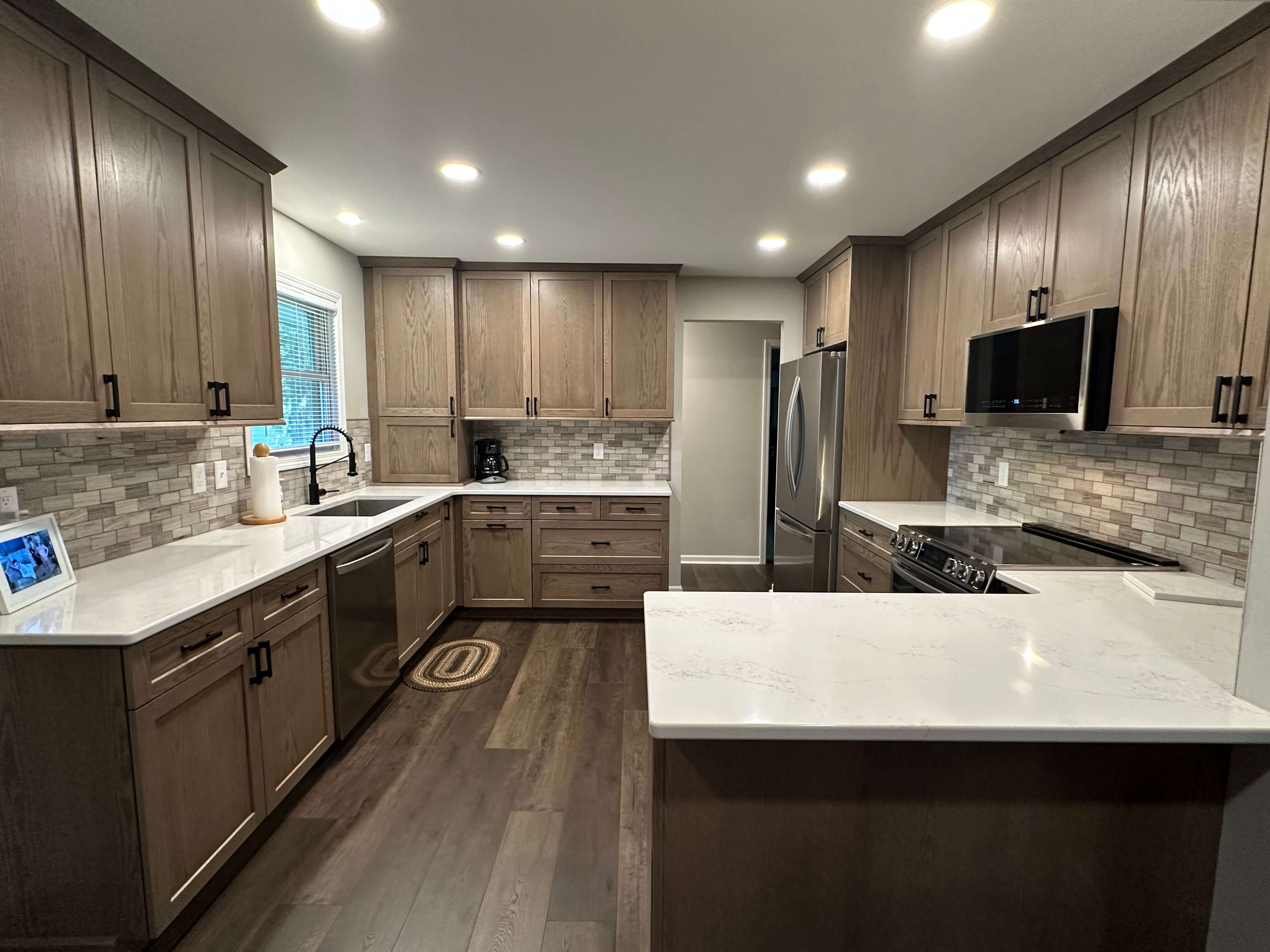 The concept was a go! Demolition began and the design was finalized. Gwen wasn’t keen on having white painted cabinets like so many other homes, so Dura Supreme’s Bria frameless cabinets with Hudson door in Red Oak with the Cashew stain was selected; not as dark as the previous cabinets, but it still added warmth and texture to the room. The original U-shape with base and wall peninsula cabinets was eliminated, which would help brighten the space and open it up.