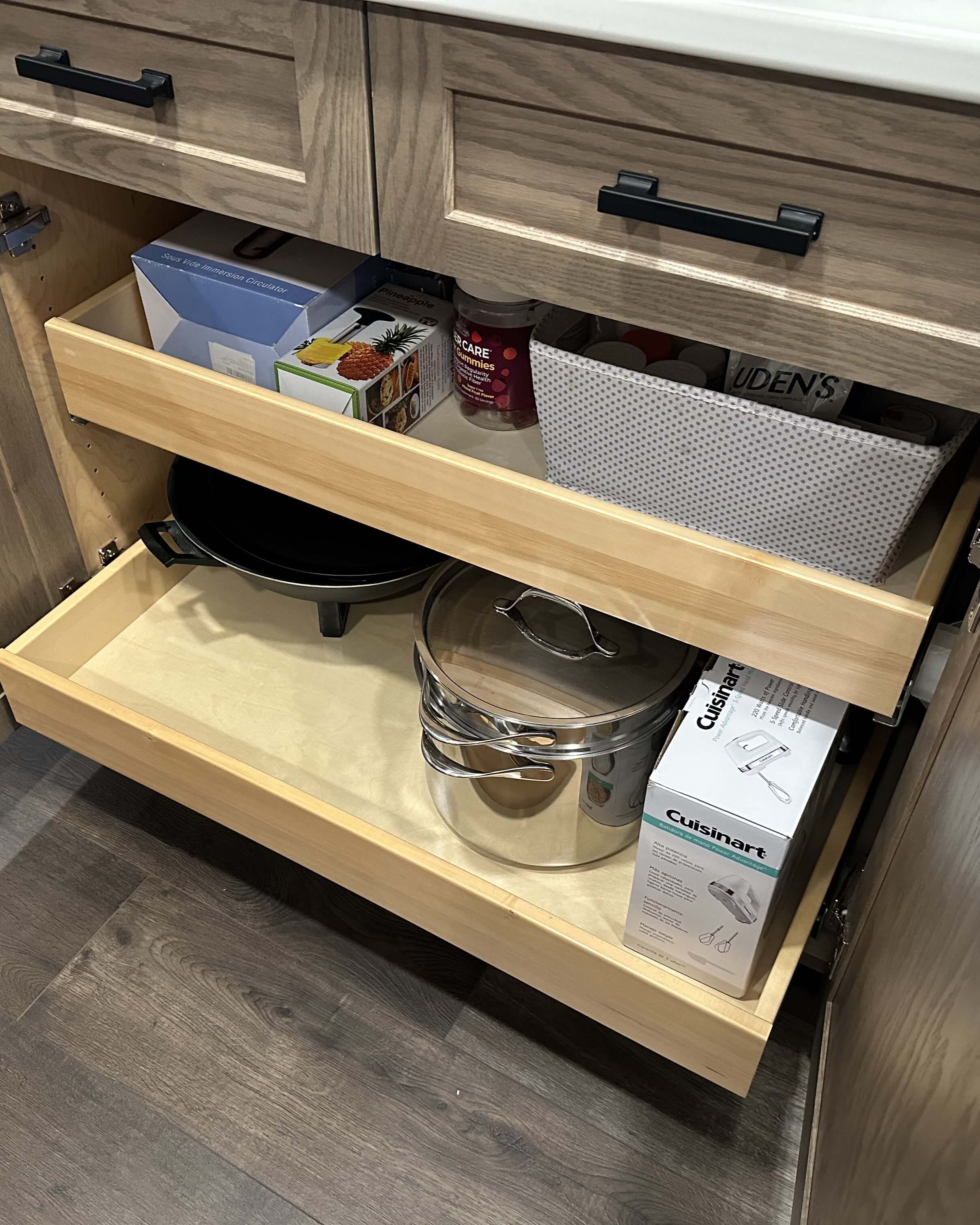 Storage is plentiful in the new design, with cabinets going to the ceiling and everything easily accessible for Gwen. Several in-cabinet conveniences were added to the design to help with storage and functionality, something she really desired in her new kitchen.