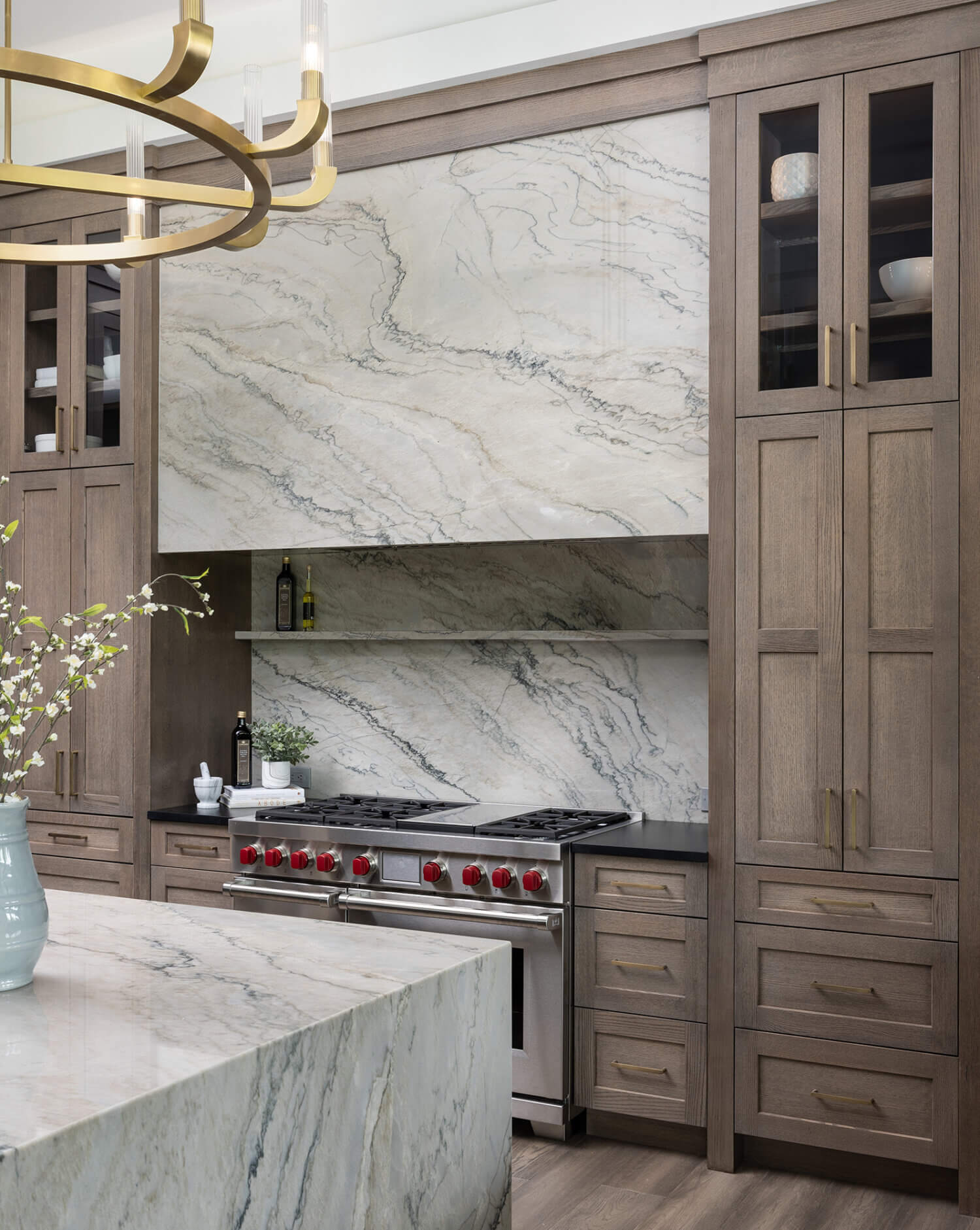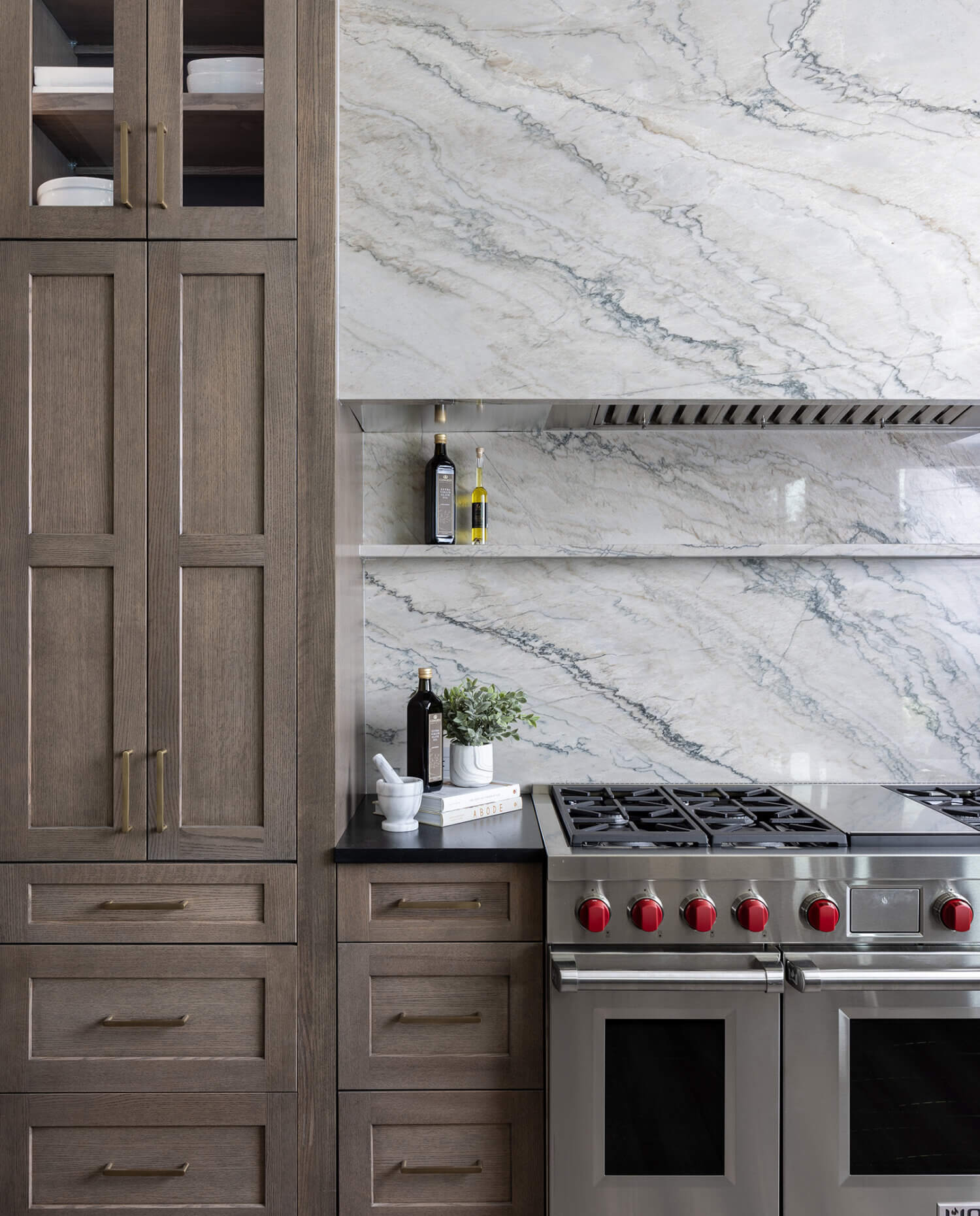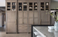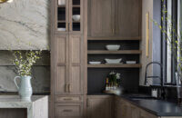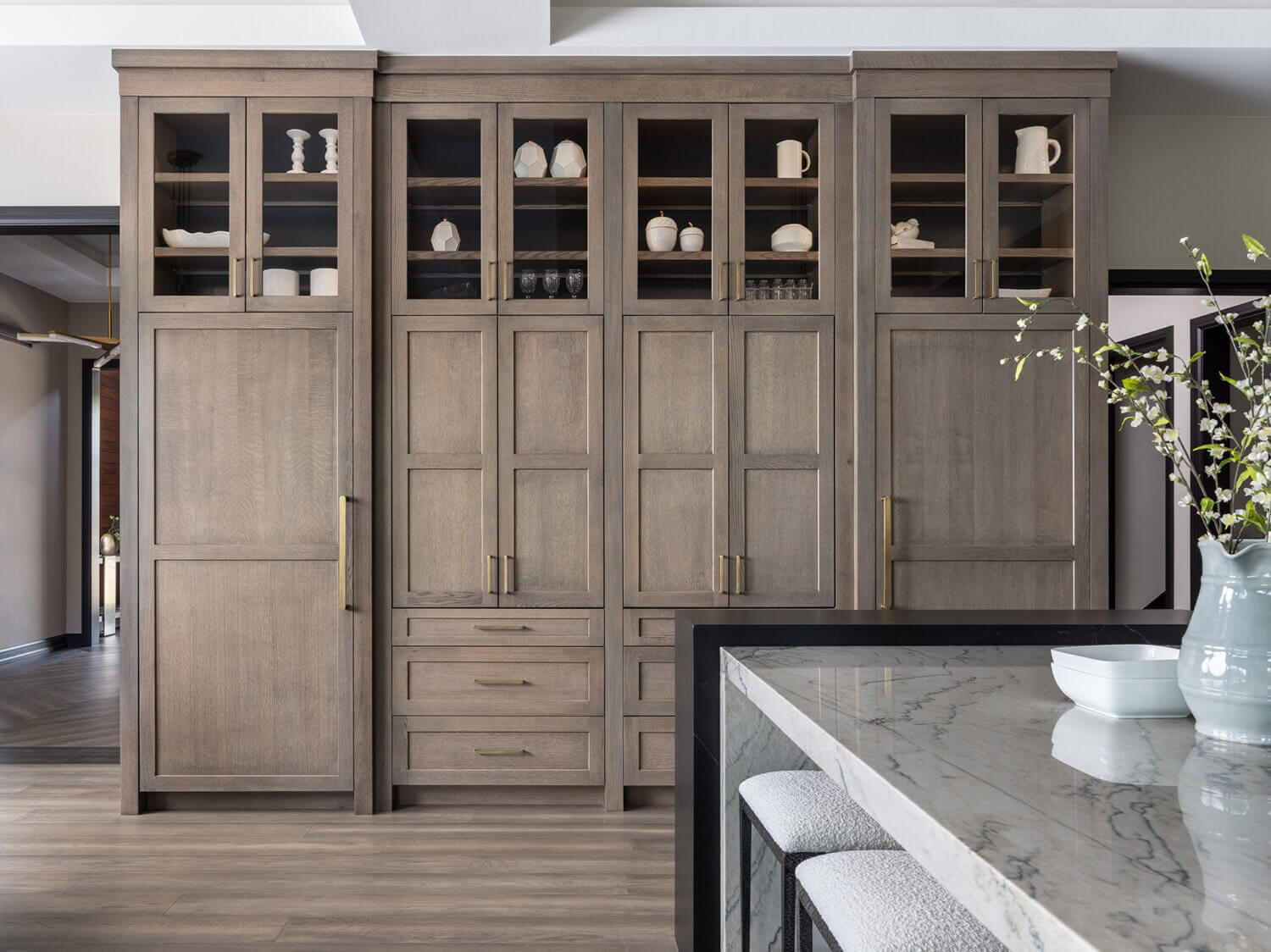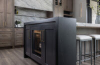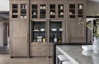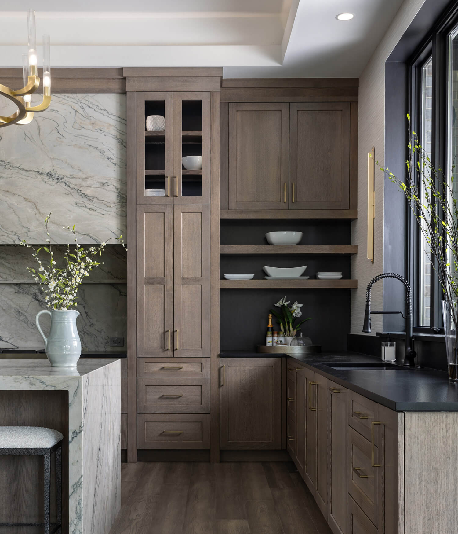 The project was what Moceri Custom Homes calls their Modern Prairie style design, a stunning new construction ranch home with an expansive open floor plan. After viewing the plans for the new build, the designer, Sandra Daubenmeyer of KSI Kitchen & Bath, quickly began envisioning a modern design with prairie-inspired, true-brown wood tones, a splash of drama, and lots of natural textures. She selected Dura Supreme’s Bria frameless cabinetry in the Carson door style, achieving a warm feel with Quarter-sawn White Oak in the “Morel” stain finish. Then Sandra added a dash of the “Onyx” stain on the Maple wood species to add some intriguing contrast to a few accent areas.
